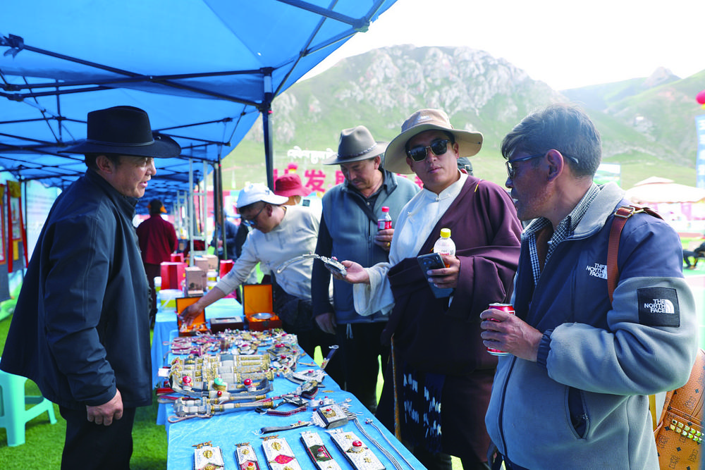 15时,比赛还未开始,球场旁的玉树州特色产品产销推介活动已经拉开大幕。展销会汇聚了来自玉树州各市县的非遗产品、农副产品及众多文创产品,吸引了众多商家和消费者参与。
