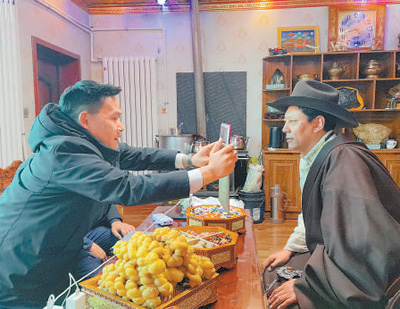 尕玛扎西(左)为伽马久美办理金融业务。乔栋 摄