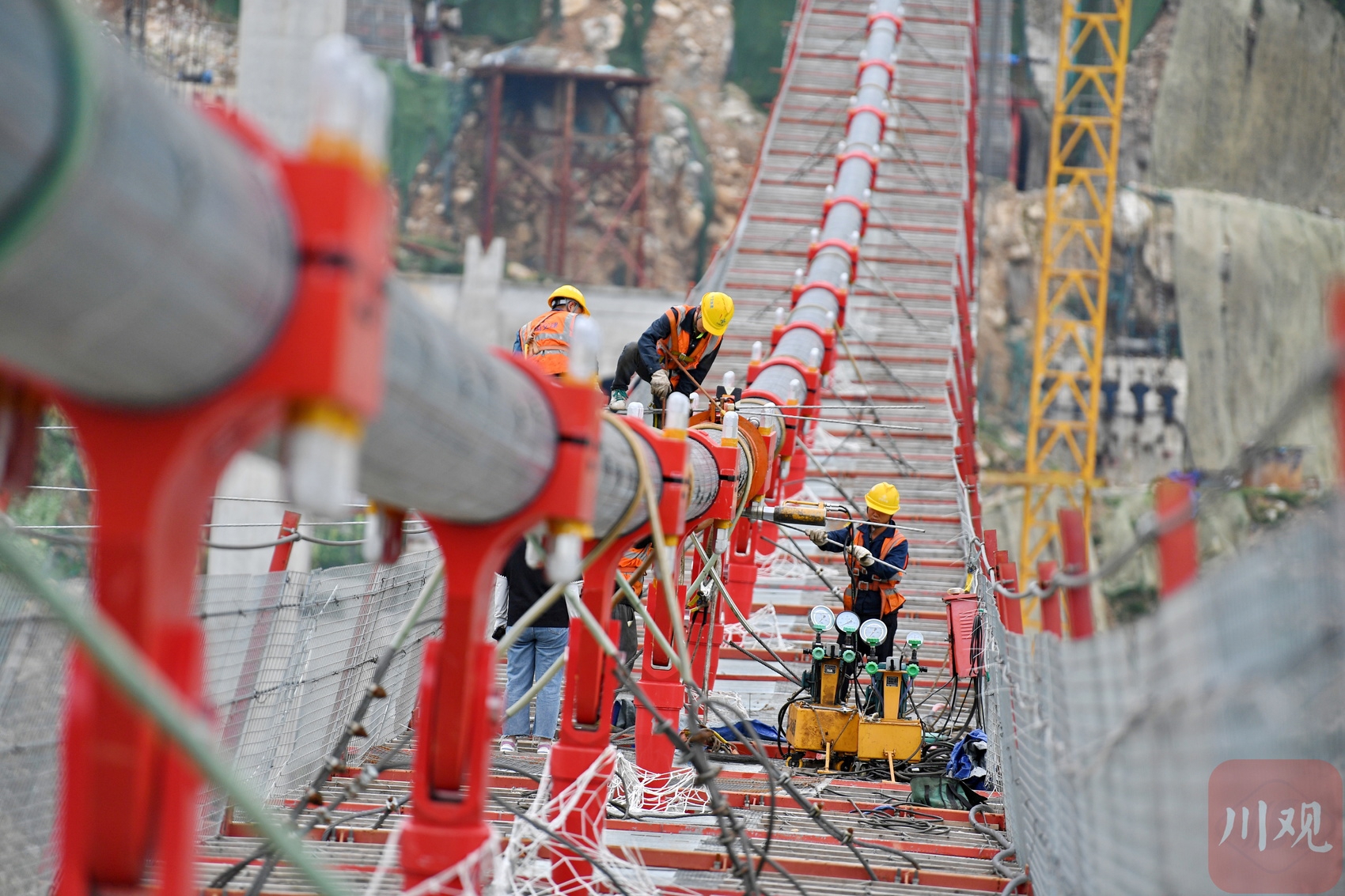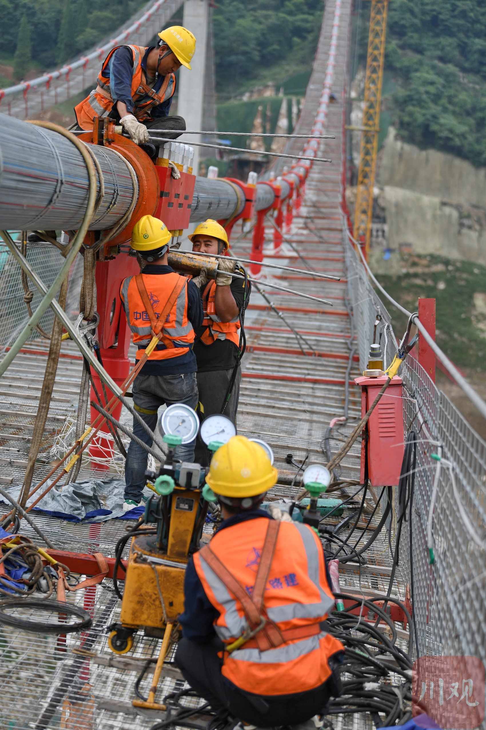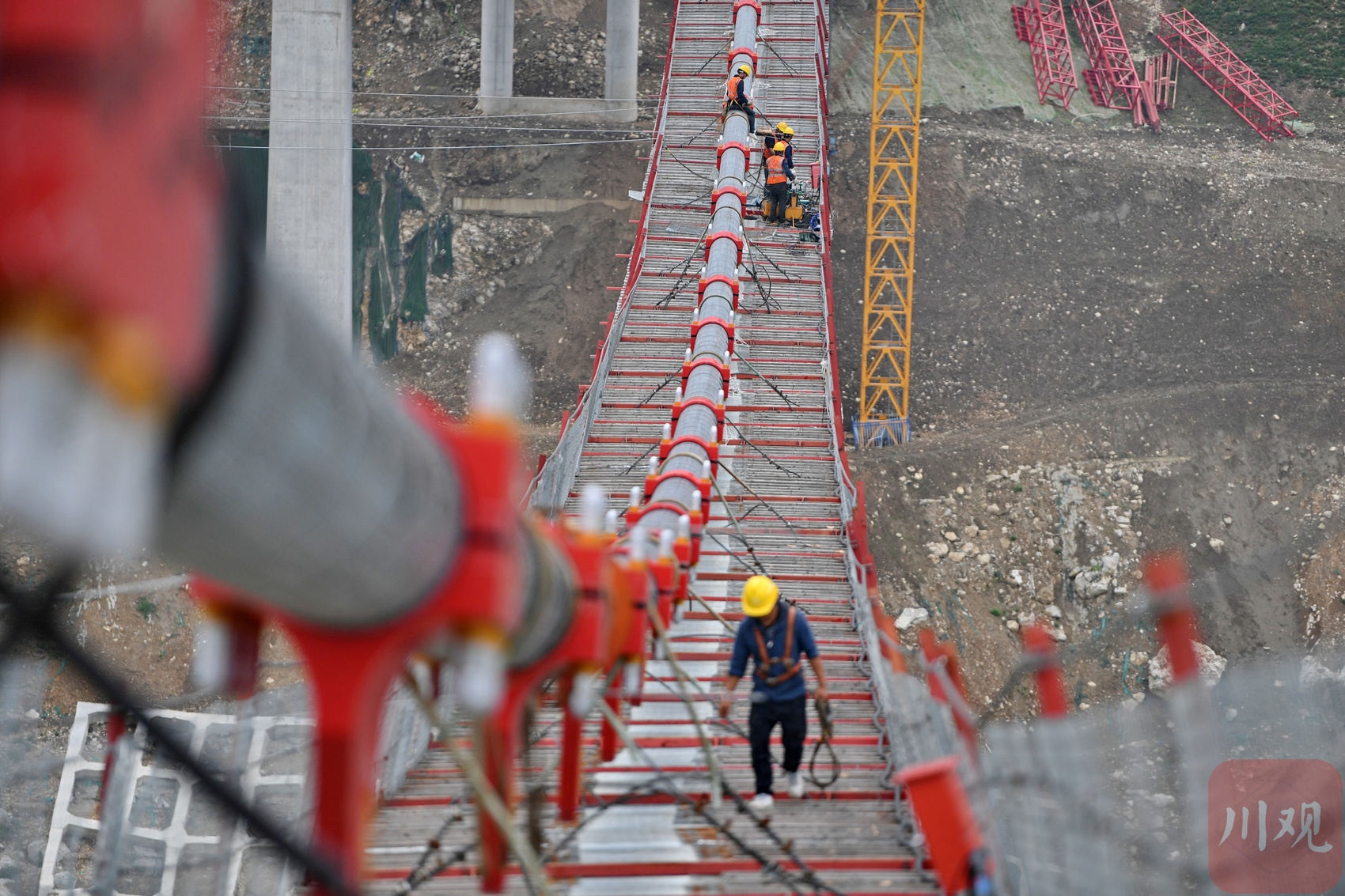 施工人员在悬索桥主缆上作业。李向雨 摄
