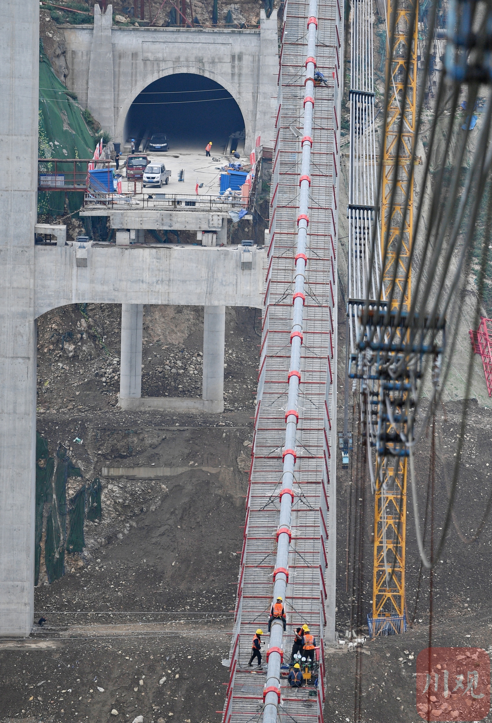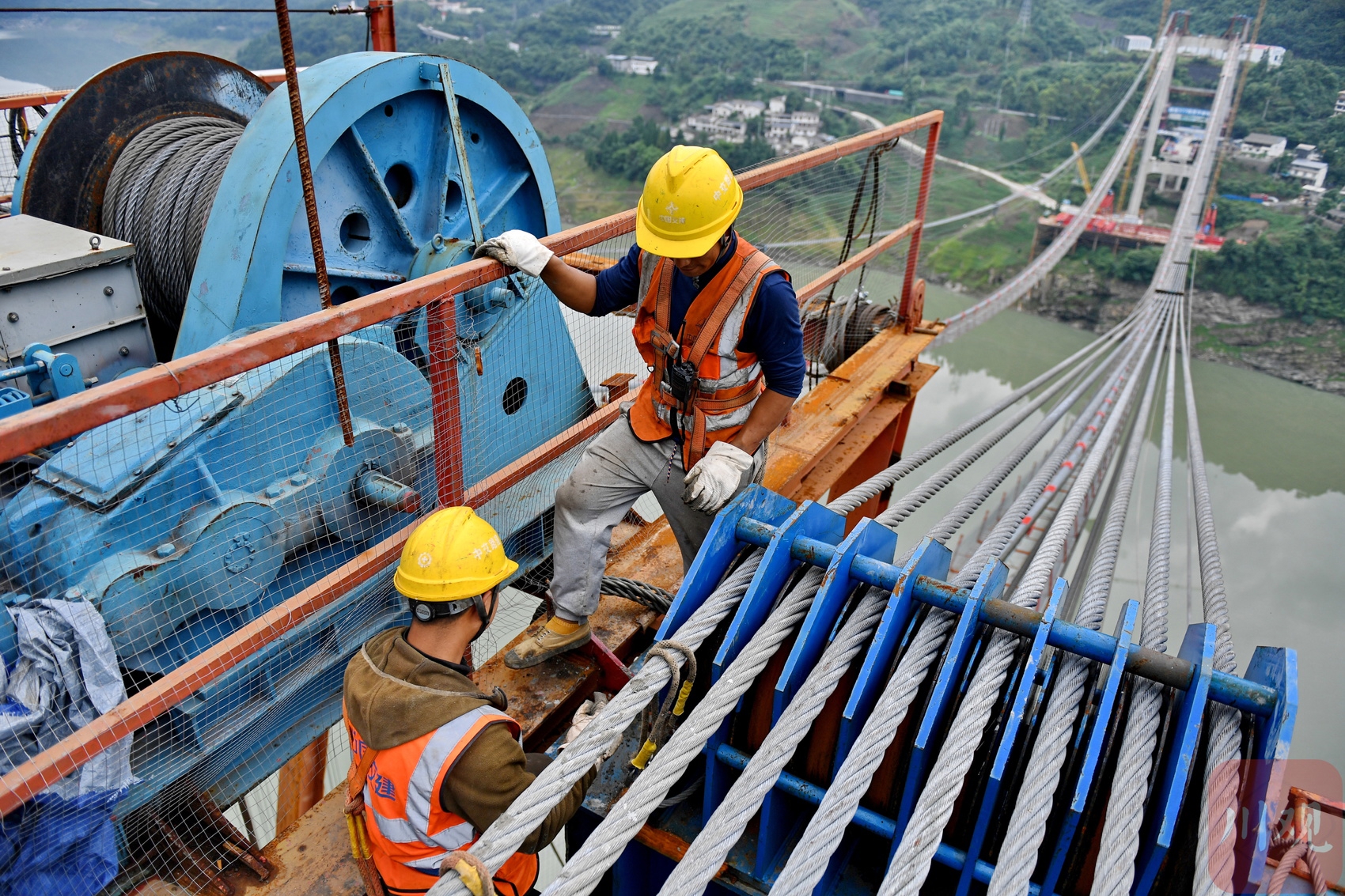 汶川县境内的国道317线友谊隧道至映秀段改建工程现场,施工人员在悬索桥主缆上作业。李向雨 摄