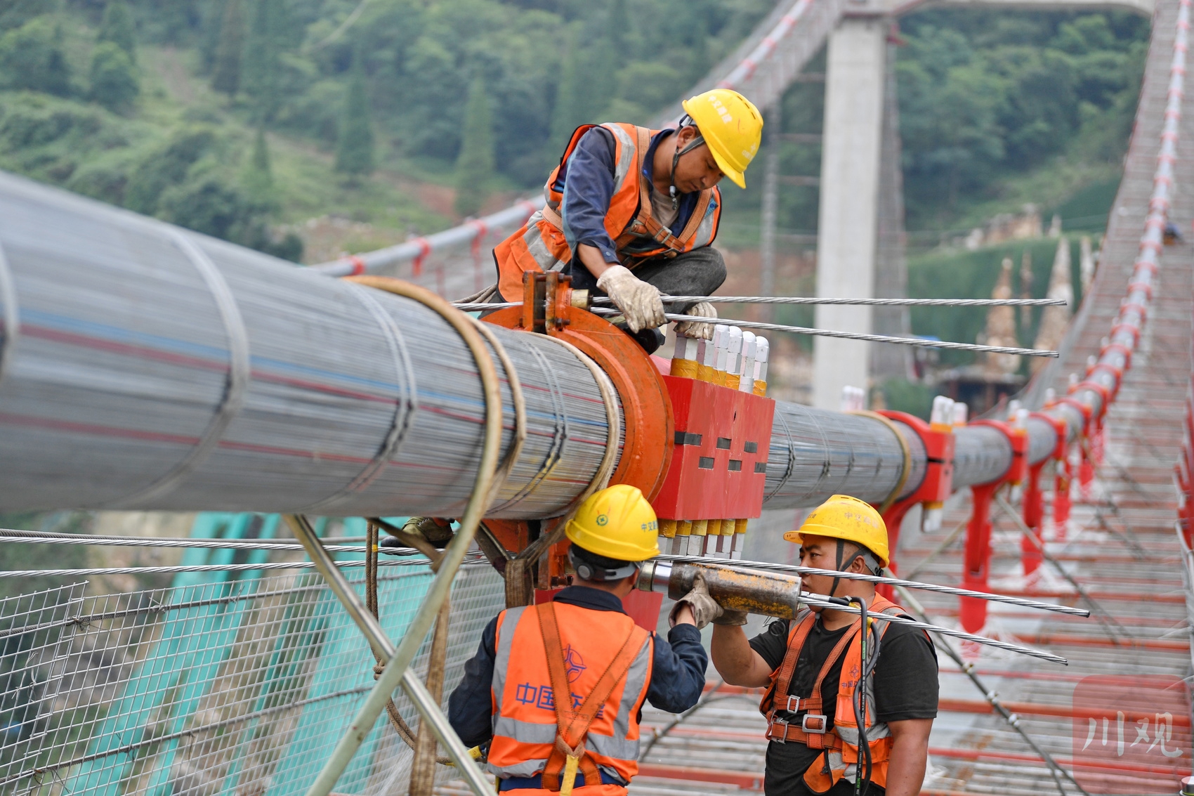 6月18日,阿坝州汶川县境内的国道317线友谊隧道至映秀段改建工程现场,施工人员忙碌在悬索桥主缆上作业。李向雨 摄
