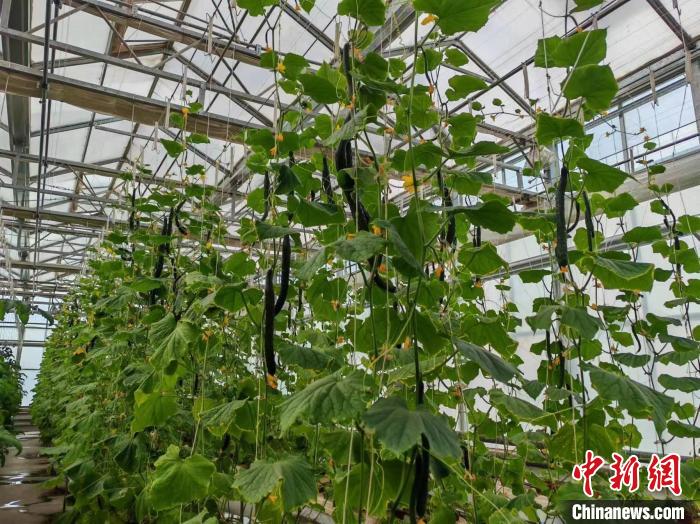 图为冷湖设施农业种植园蔬菜种植区,一条条鲜嫩的黄瓜挂在枝头。 茫崖市融媒体中心 供图
