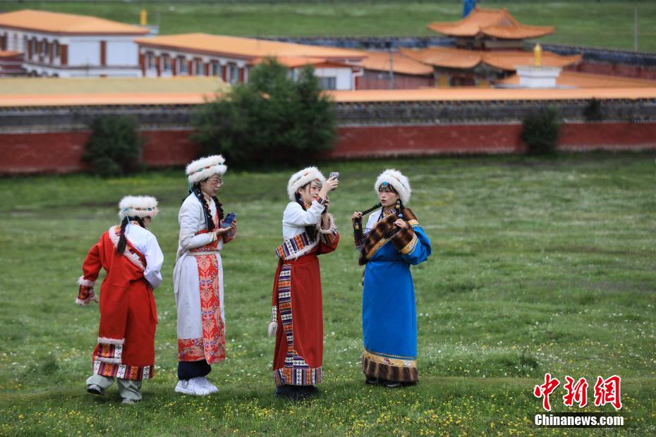 6月28日,游人身着民族服饰在草原上拍照游玩。中新社记者 王磊 摄
