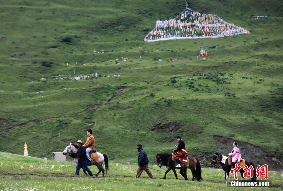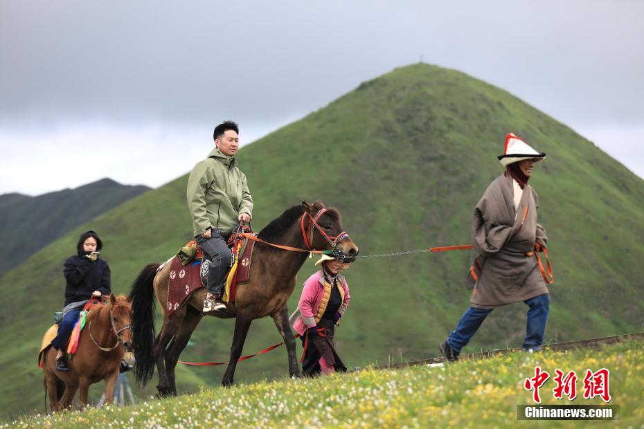 6月28日,游人骑马走在草原上。中新社记者 王磊 摄