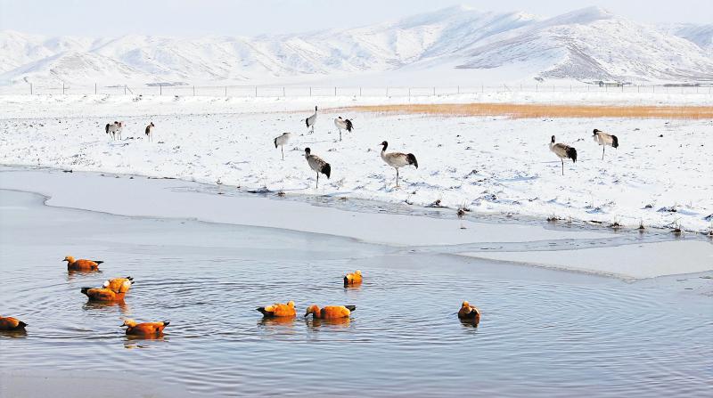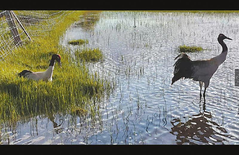 6月13日,黑颈鹤群与赤麻鸭在白河流域湿地中和谐相处。