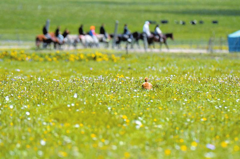 7月1日,马队穿过牧民供波甲的草场,不远处的草丛中藏有一只幼鹤。