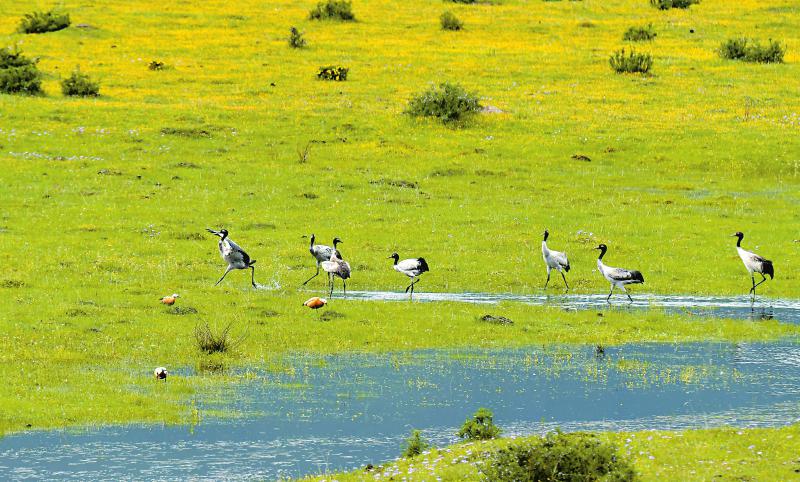 黑颈鹤是世界濒危物种之一,主要生活在海拔2500至5000米之间。每年6月至7月是它们求偶、产卵和孵化幼鸟的关键时期;到了10月至11月下旬,它们则会携家带口迁徙至越冬地。