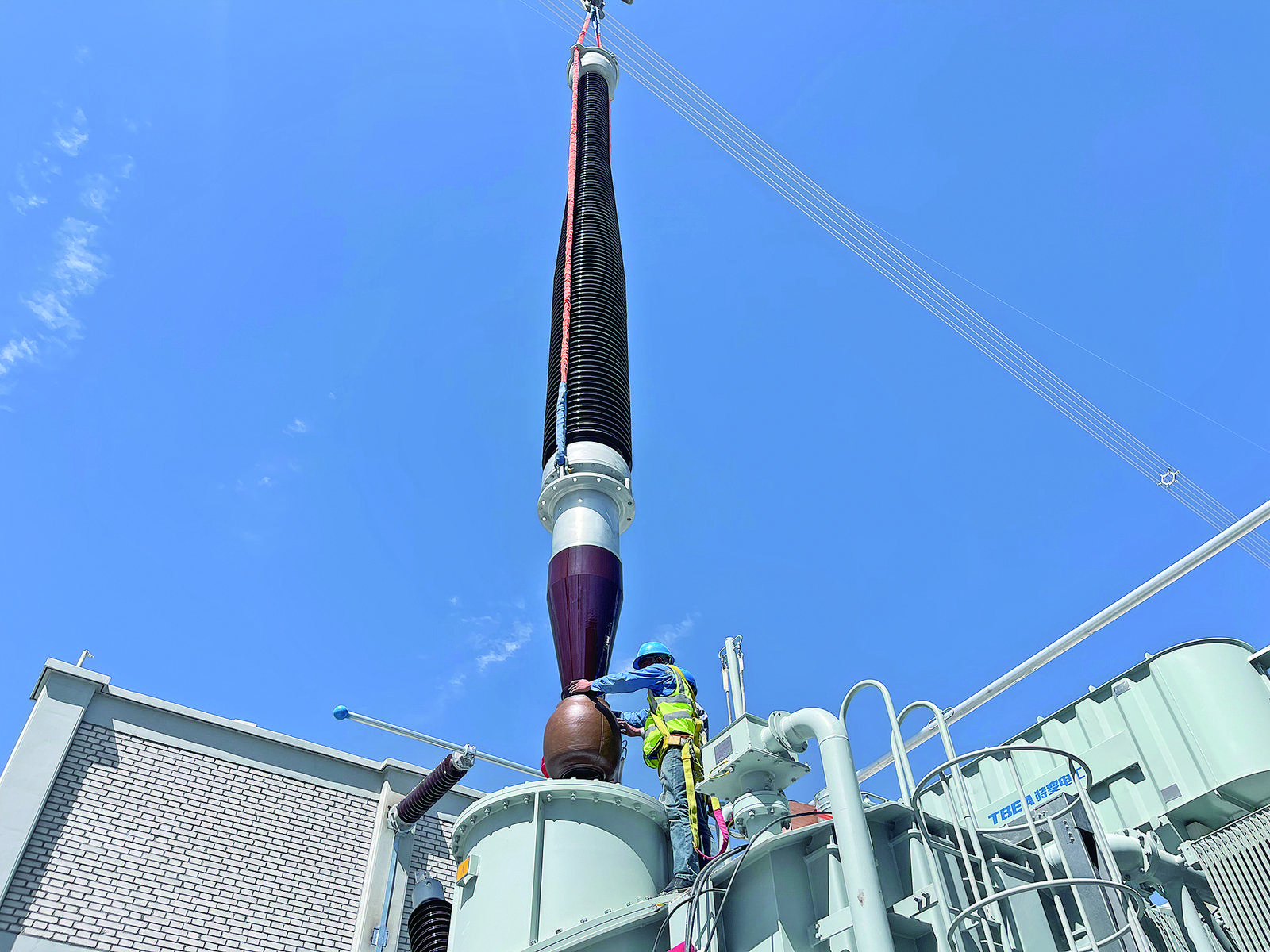 在高明的引导下,记者按规范要求佩戴好安全头盔进入施工现场,只见一座座银色的钢构架高高耸立,变电站已显露出雏形。施工区域内处处是忙碌的景象,工人们头戴蓝色安全帽,在安全带等安全设备的保护下,正挥汗如雨抓紧进行电气安装作业;不远处,一台台巨大的吊车伸展手臂,缓缓起吊,将一台台沉重的电气设备精准地吊运到指定位置。