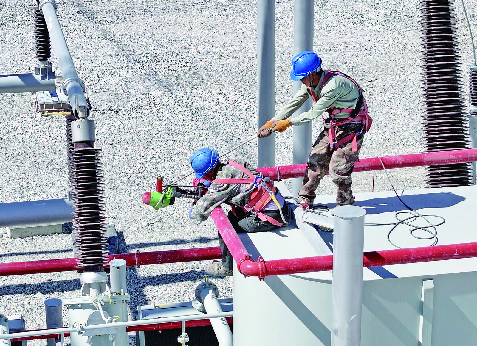 “前几天,我们进行了对接母线筒等工作,加快了这里的电气设备安装进度,目前户内GIS安装已完成20%。”高明说,在变电站加速施工的同时,鱼卡—丁字口双回750千伏线路工程在完成939座铁塔组立工作后,已全面进入导地线架设冲刺阶段,目前导地线架设已完成86.8%,预计9月底可完成全部架线任务。