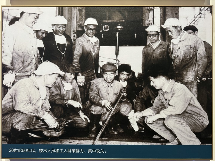 原子城纪念馆展示的二二一厂技术人员和工人集中攻关的照片。新华社 潘旭 摄