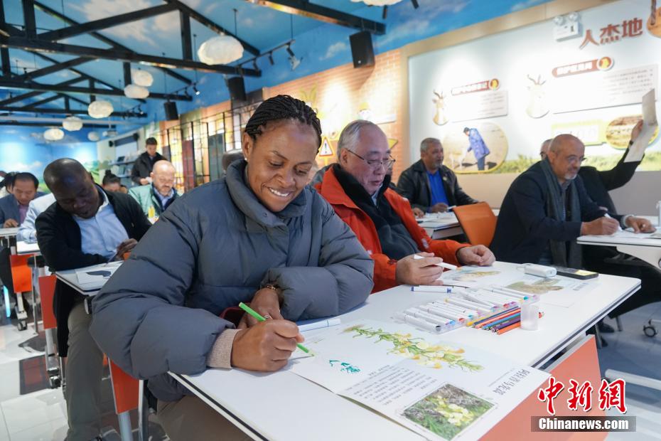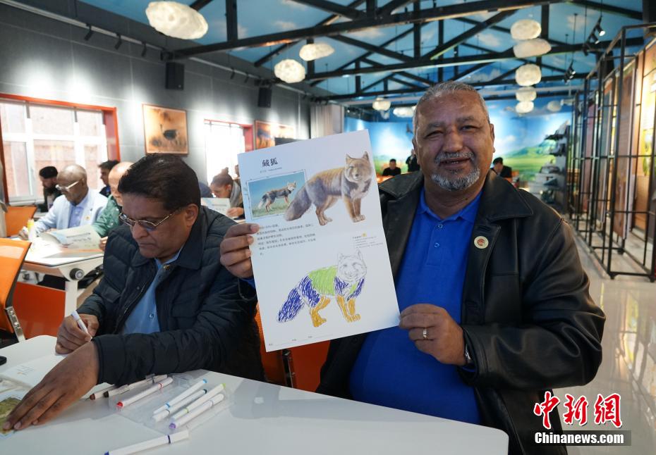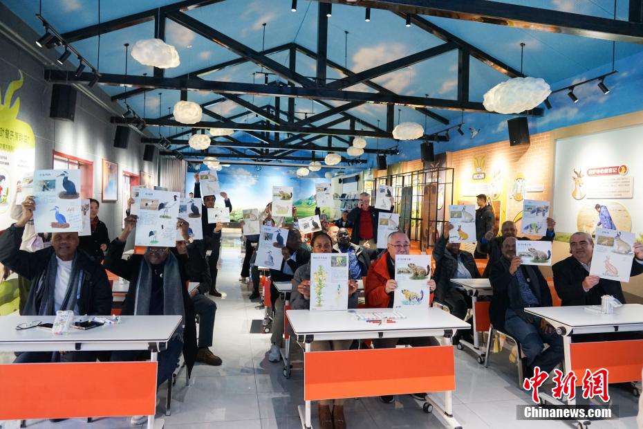 图为在青海湖普氏原羚人工救助繁育科研基地内,代表团成员手绘青海湖代表性物种图卡。中新社记者 马铭言 摄