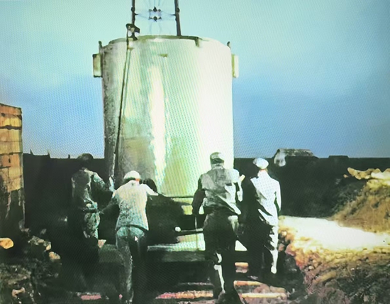 他们是黄昏时分装完第一颗原子弹的。他记得太阳已西下,他们把原子弹稳稳当当吊到地面,放到大铁罐里,4个人用平板车把它推到那高达102米的铁塔下面。他们因此留下过一张难得的现场相片,尽管是背影。