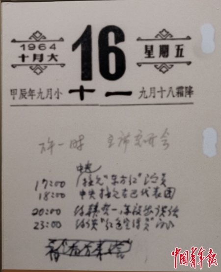 青海原子城纪念馆展出的周恩来总理1964年10月16日的日程表。他在接见《东方红》演职人员时宣布了第一颗原子弹爆炸成功的消息。张国 摄