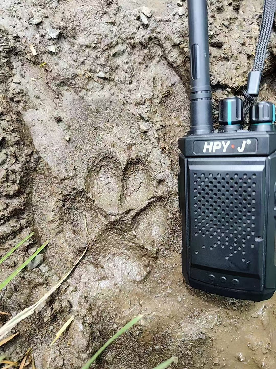 惊喜有时会不期而至。今年夏天,在小金县附近一个网格取回去年安装的相机时,由于山上雪太厚,调查队并没有找到此前安装的相机。不过,在下山路上,大自然赠送了他另一份“礼物”——一枚和对讲机一般大,梅花形状,疑似雪豹的脚印。