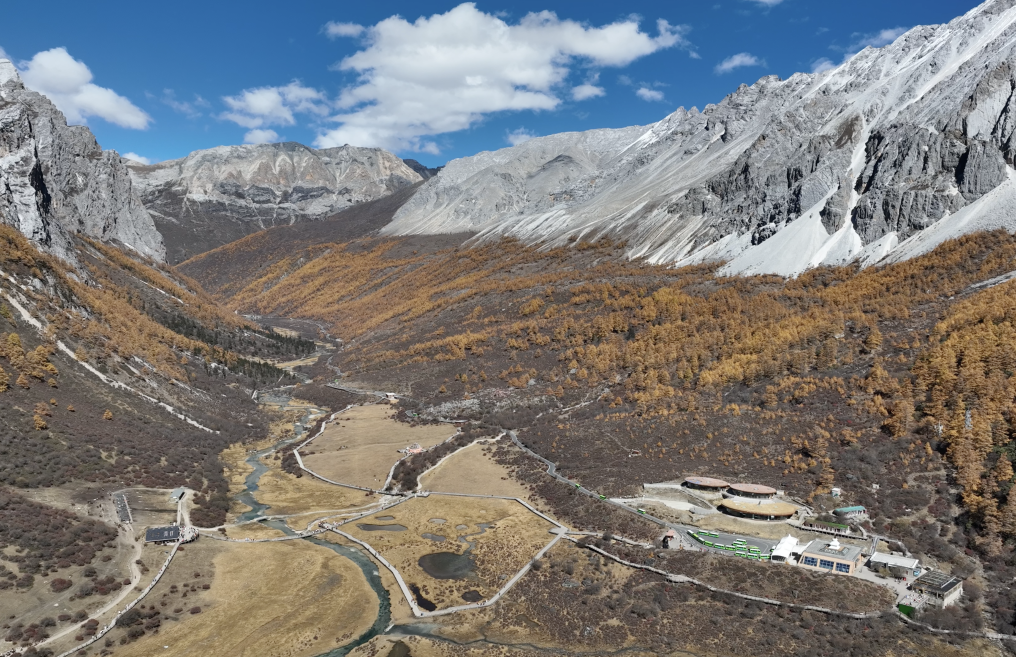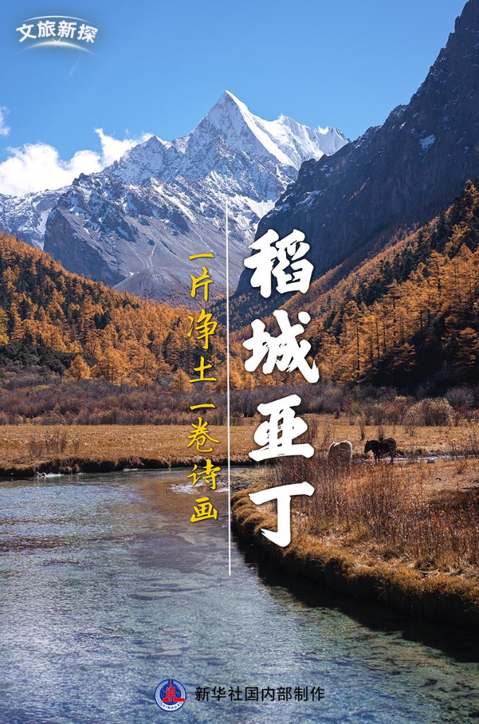 深秋的亚丁五彩斑斓,湛蓝的天空下山谷秋叶缤纷、层林尽染,万年的皑皑雪山与千年的蔚蓝海子遥相呼应,黑色的牦牛多如繁星般点缀在金黄的草甸之上。漫步在洛绒牛场,几条蜿蜒的小溪宛如一条条丝带飘绕在草原上。仰头环视,藏族群众心中的三座“神山”呈“品”字形矗立在远处,守护着这片绝美净土。