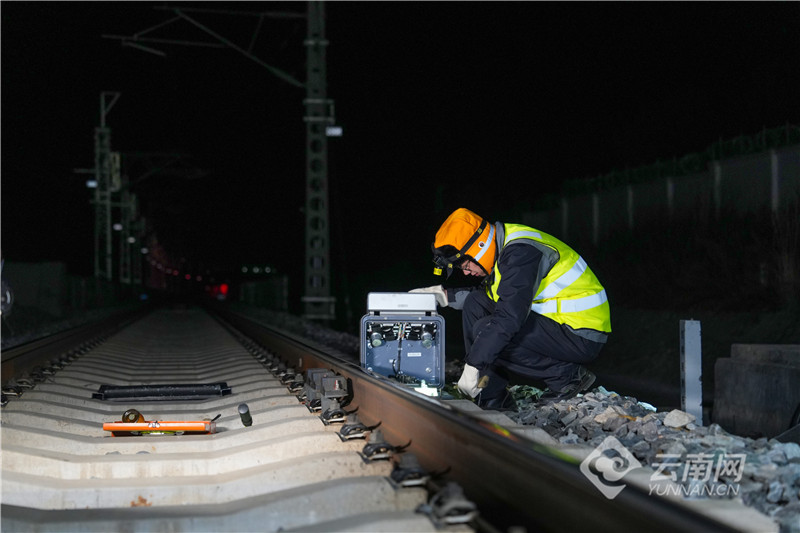 23时,赵丽程和工友们到达作业点,他们分工合作,开始对设备进行机械参数测定、测温探头定标、电流信号传输试验等工作。寂静的股道上,他们弯腰、下蹲、匍匐,尽量让视线与钢轨平齐保证机械参数测量精度,点点头灯在轨道间不停晃动,操作工具发出的“叮当”声格外响亮。