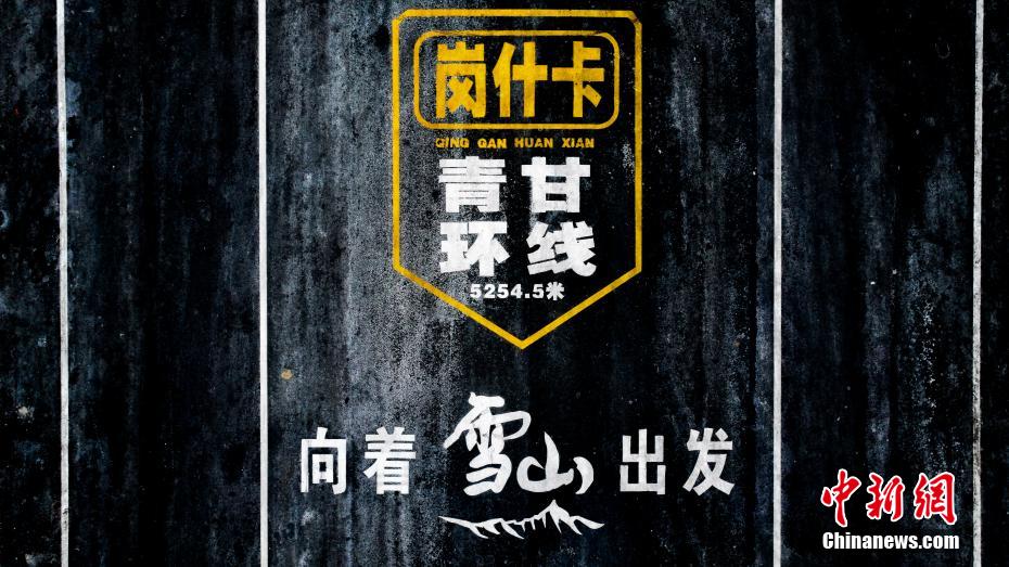 图为岗什卡雪峰景区路面标识。(无人机图片)中新社记者 薛蒂 摄