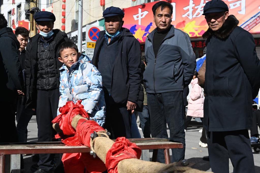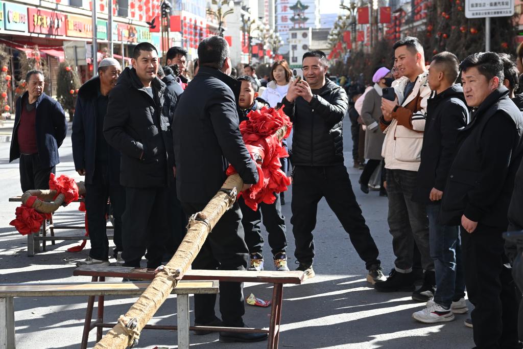 2月10日,在临潭县城关镇西大街,当地群众抬起万人扯绳活动的绳头拍照留念。新华社记者 范培珅 摄