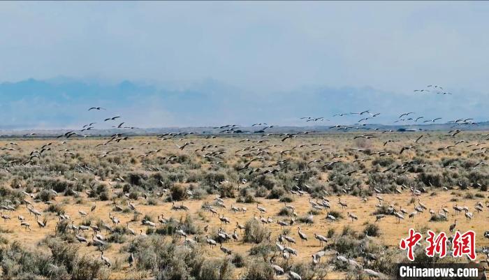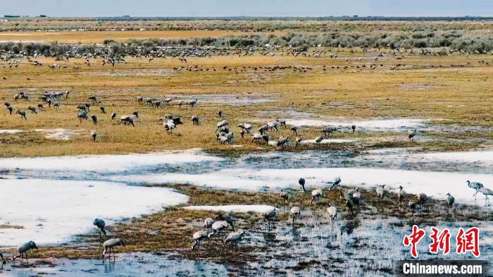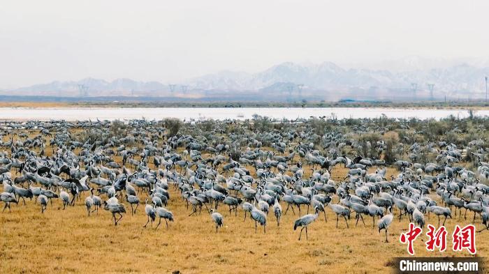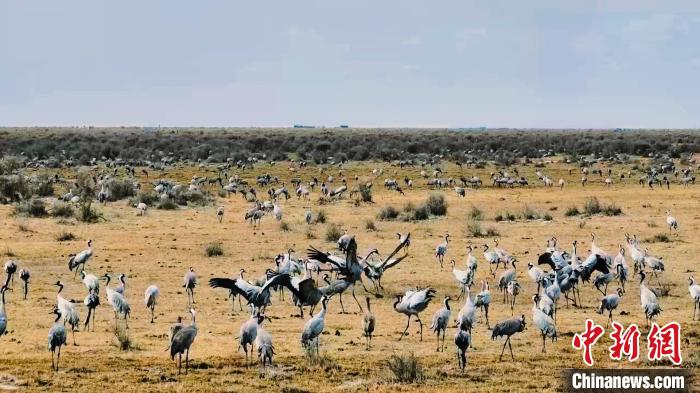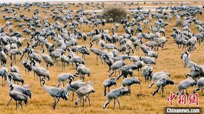 连日来,成群灰鹤聚集于青海省海西蒙古族藏族自治州都兰县巴隆乡铁丝盖地区。灰鹤是国家二级重点保护野生动物。