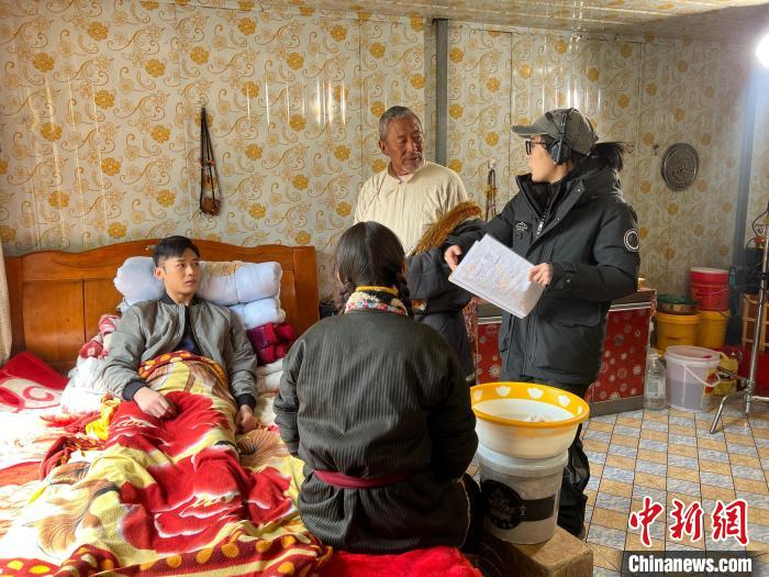 资料图为洛桑群培(站,左)在微电影《五十七公里》片场。 马铭言 摄