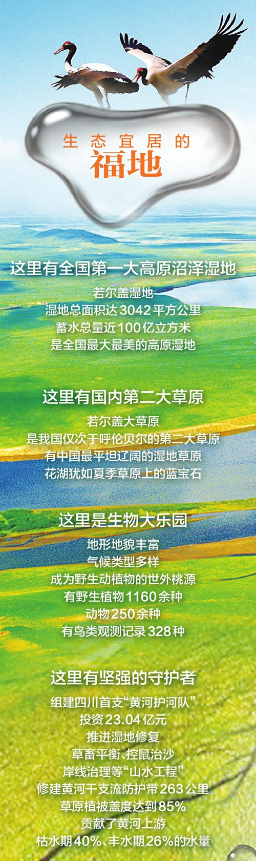 水是万物之源,更是若尔盖的灵魂。一滴水,衍生了世界上面积最大、保存最完整的高寒泥炭沼泽湿地,成就了世界上最奇特的“固体高原水库”,是长江、黄河上游重要的水源涵养区,是“中华水塔”的重要组成部分。
