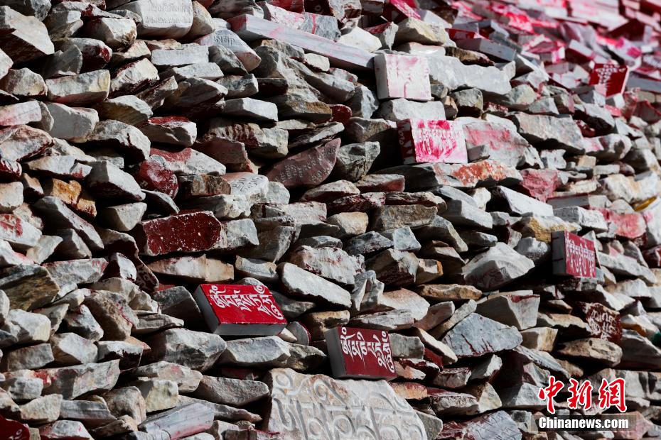 4月12日,在青海省玉树藏族自治州玉树市,玛尼石堆一景。据了解,玉树嘉那玛尼石的形成和发展已有300多年的历史,嘉那玛尼石经城内石刻数量多达25亿块,2002年被载入吉尼斯世界纪录,成为世界最大的玛尼堆。中新社记者 薛蒂 摄