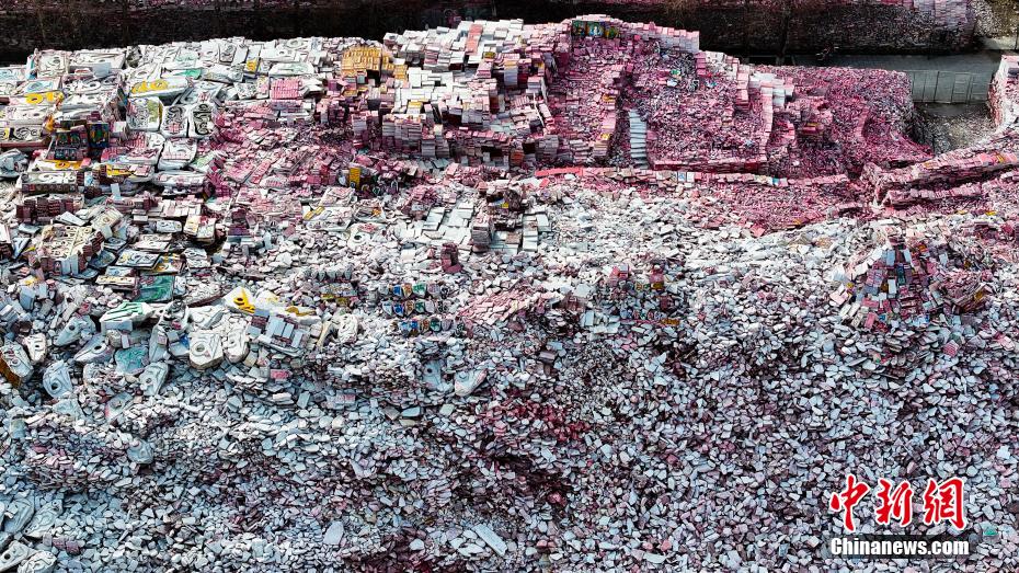 4月12日,在青海省玉树藏族自治州玉树市,航拍世界最大玛尼石堆。据了解,玉树嘉那玛尼石的形成和发展已有300多年的历史,嘉那玛尼石经城内石刻数量多达25亿块,2002年被载入吉尼斯世界纪录,成为世界最大的玛尼堆。中新社记者 薛蒂 摄