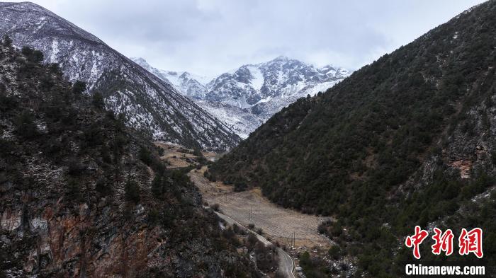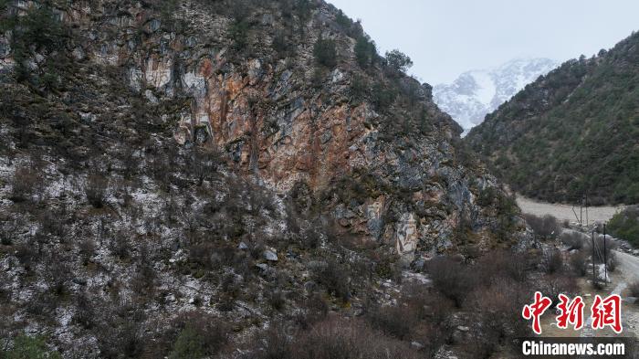 4月12日,航拍青海省玉树藏族自治州玉树市勒巴沟。勒巴沟藏语意为“美丽的沟”,沟内保留着距今1300多年的岩画。(无人机照片) 中新社记者 薛蒂 摄