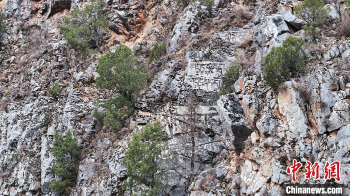 4月12日,游客在青海省玉树藏族自治州玉树市勒巴沟拍摄岩画。勒巴沟藏语意为“美丽的沟”,沟内保留着距今1300多年的岩画。沟内两侧山体上刻有石刻经文,被称为“山玛尼”。溪水流经之处还有独特的“水玛尼”景观。中新社记者 薛蒂 摄