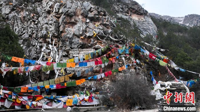 4月12日,航拍青海省玉树藏族自治州玉树市勒巴沟内的“山玛尼”。勒巴沟藏语意为“美丽的沟”,沟内保留着距今1300多年的岩画。沟内两侧山体上刻有石刻经文,被称为“山玛尼”。溪水流经之处还有独特的“水玛尼”景观。(无人机照片) 中新社记者 薛蒂 摄