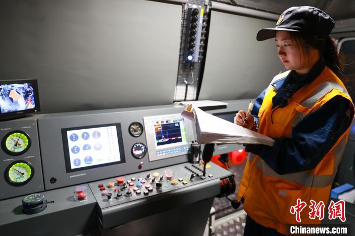 4月27日,中国铁路青藏集团有限公司西宁工务机械段养路机械驾驶员俞庆完成作业后填写验收单。中新社记者 薛蒂 摄