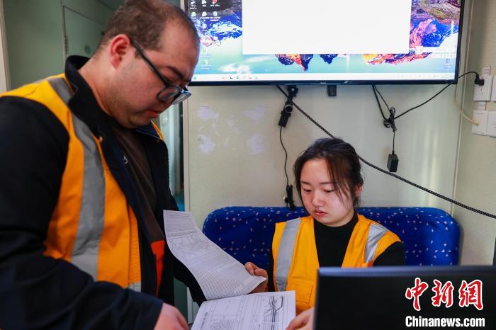 4月27日,中国铁路青藏集团有限公司西宁工务机械段养路机械驾驶员俞庆(右一)与同事交接文件。中新社记者 薛蒂 摄