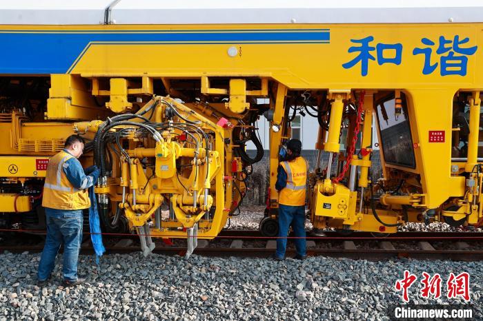 4月27日,中国铁路青藏集团有限公司西宁工务机械段养路机械驾驶员俞庆(右一)和同事一起保养设备。中新社记者 薛蒂 摄