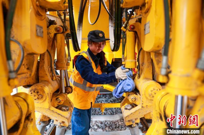 4月27日,中国铁路青藏集团有限公司西宁工务机械段养路机械驾驶员俞庆擦拭捣固车工作装置。中新社记者 薛蒂 摄