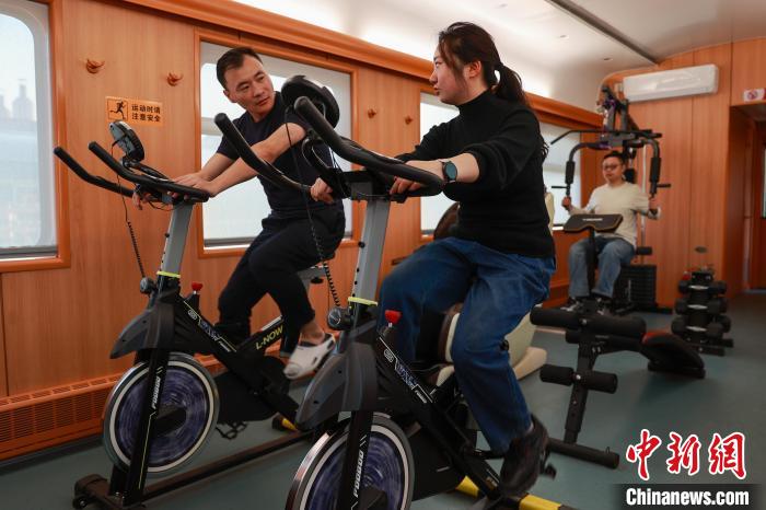 4月27日,中国铁路青藏集团有限公司西宁工务机械段养路机械驾驶员余庆(右一)和同事在宿营车内健身。中新社记者 薛蒂 摄