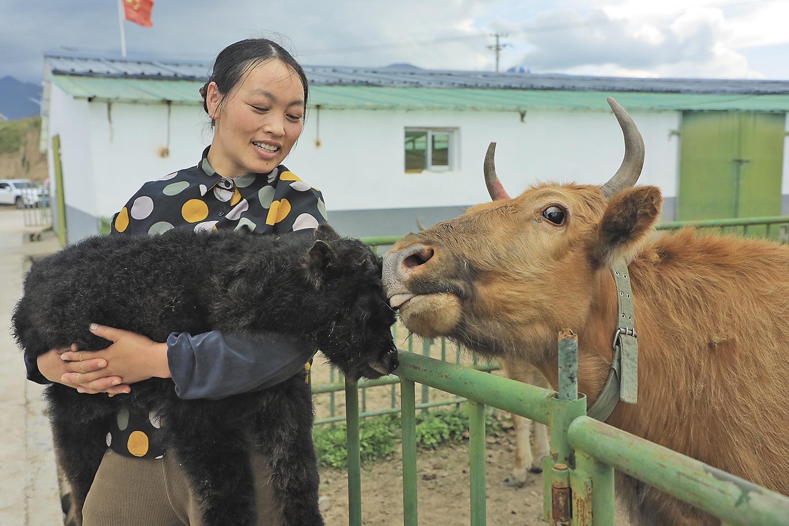 合作社女工抱着刚出生的娟姗犏牛宝宝。