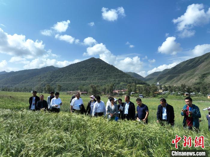 2023年8月,农业专家们调研尕旦木草公司的青稞种植基地。(资料图)受访者供图