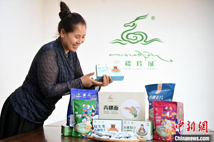 图为“青稞姐姐”尕旦木草展示公司所研发的青稞产品。九美旦增 摄