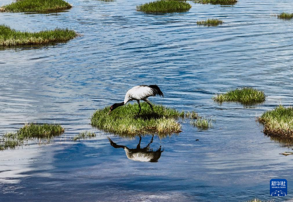 这是6月4日在青海隆宝国家级自然保护区拍摄的黑颈鹤(无人机照片)。新华社 杜笑微 摄
