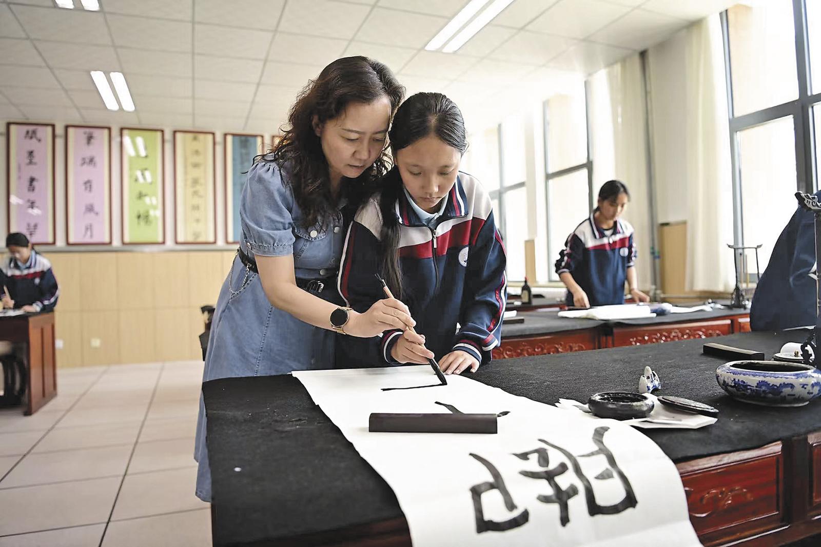 学校聘请了专业的书法老师为学生教授书法。陆广涛 摄