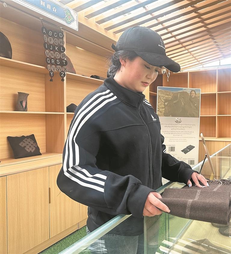 在村寨核心地段的“藏城之窗”体验区,刚刚大学毕业的村民多杰吉正在摆放绿松石、玛瑙等具有民族特色的饰品。“这里是我们村集体经济的一部分,2024年7月开业,现在为9家公司和20多个手工作坊代售商品。除了牦牛肉干、沙棘果汁等农特产品,这种牛绒制成的围巾和帽子也很受欢迎。”多杰吉热情地取下一条牛绒围巾,未经过染色处理的棕黑色围巾摸上去质地十分柔软。