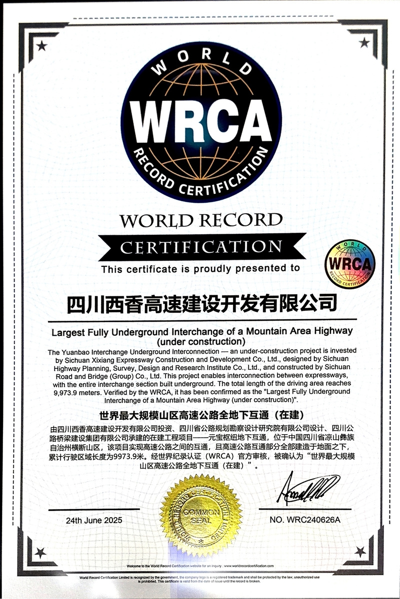 日前,西香高速公路元宝枢纽地下互通,被WRCA(世界纪录认证公司/机构)认证为“世界最大规模山区高速公路全地下互通(在建)”。WRCA是全球包括中国唯一获批相关世界纪录认证商标的机构。