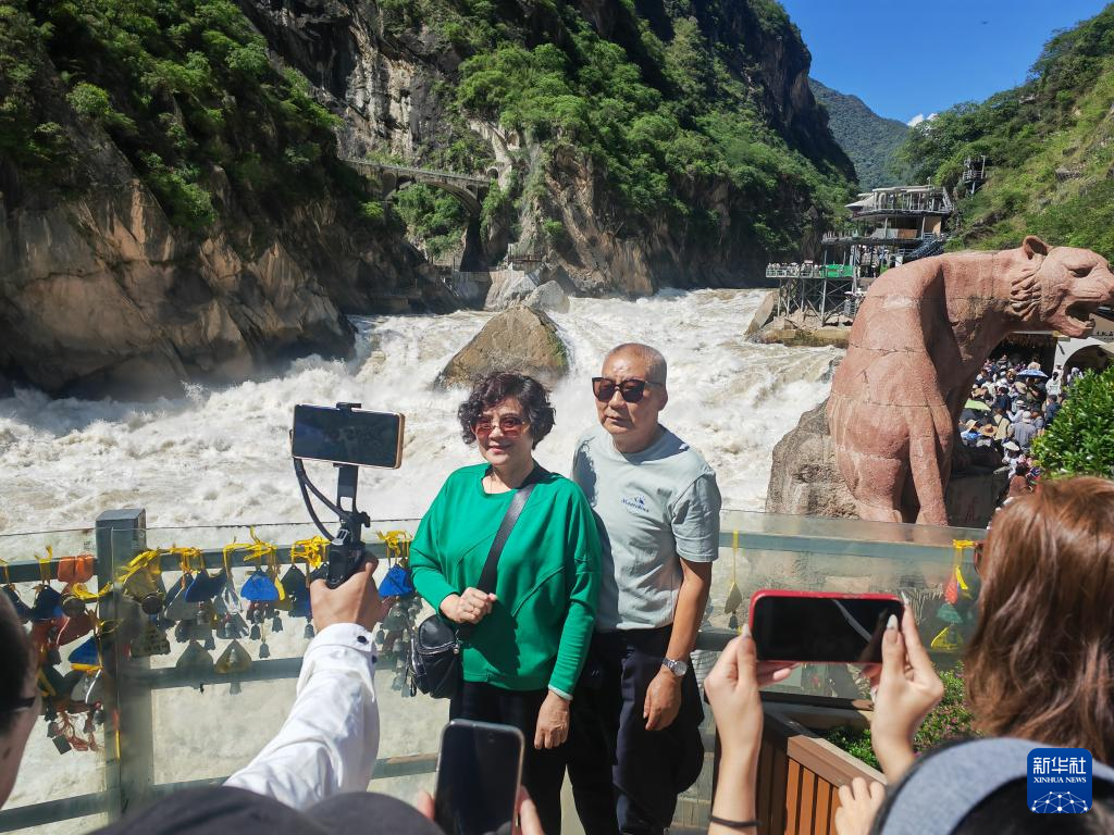 6月26日,游客在虎跳峡景区拍照留念。新华社记者 浦超 摄