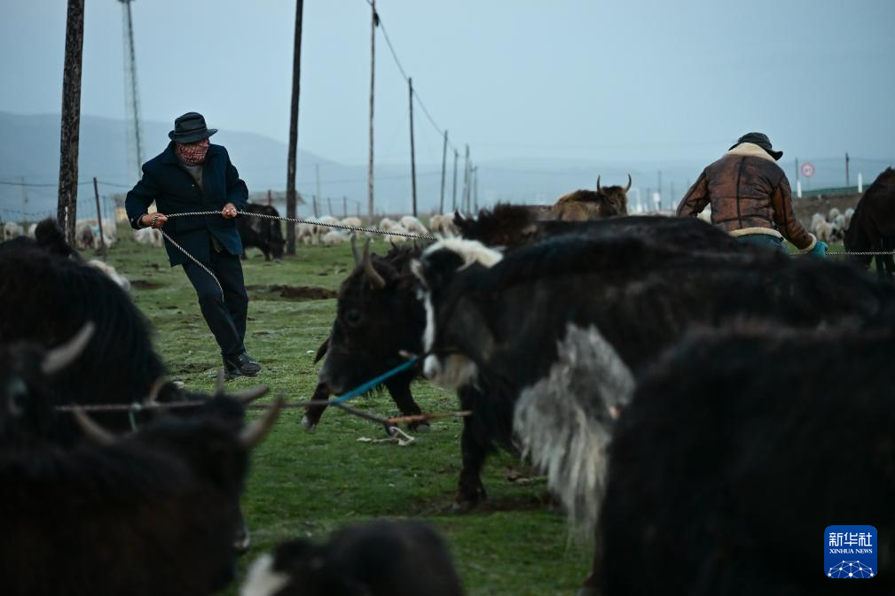 6月25日下午,万卓(左)与先巴尖措在临时休息点上拴牦牛,防止牦牛在夜间混入其他牧民家转场的牛群中。新华社记者 齐芷玥 摄