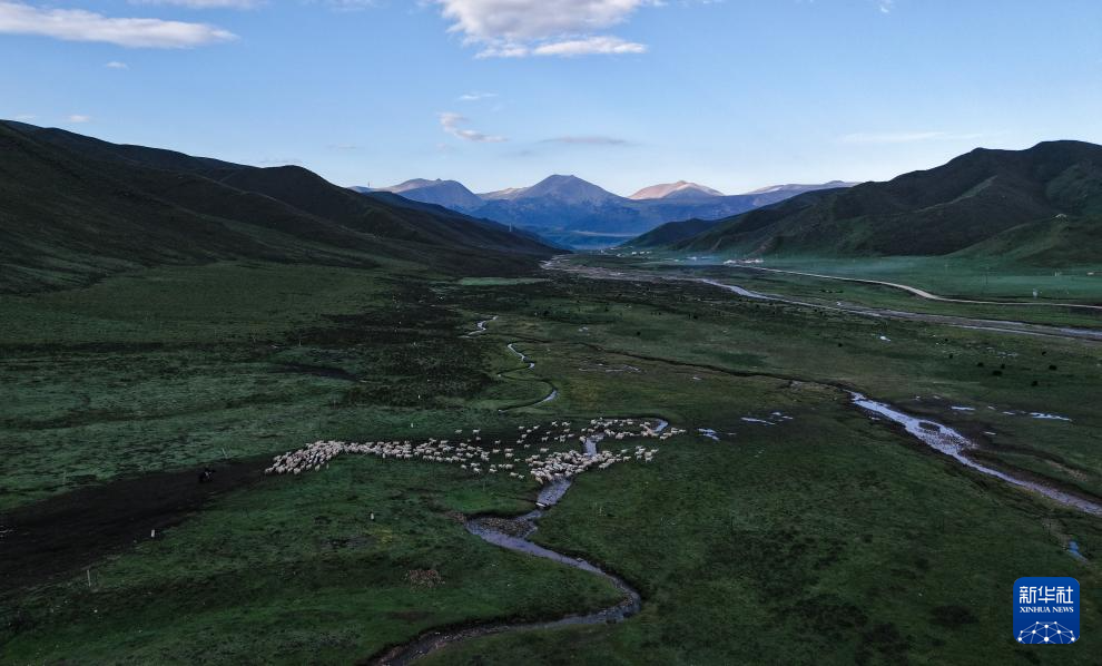 6月25日清晨,万卓与先巴尖措赶着牛羊在转场路上(无人机照片)。新华社记者 张龙 摄