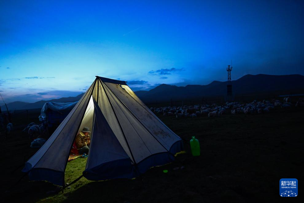6月25日夜间,先巴尖措在帐篷内休息。新华社记者 张龙 摄