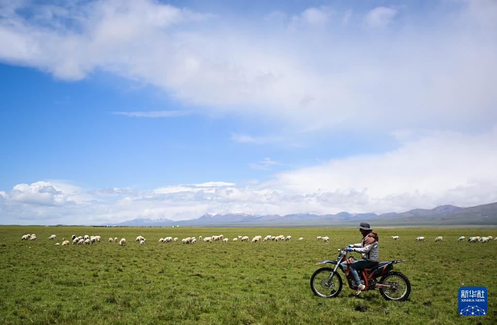 6月26日,先巴尖措在夏牧场骑着摩托放牧。新华社记者 张龙 摄