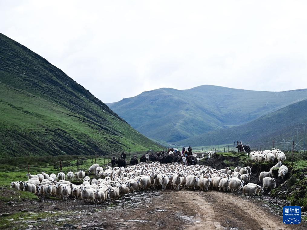 6月25日,默勒镇才什土村的牧民在转场。为了防止羊群混到一起,万卓与外甥先巴尖措在后方骑着马控制羊群。新华社记者 张龙 摄