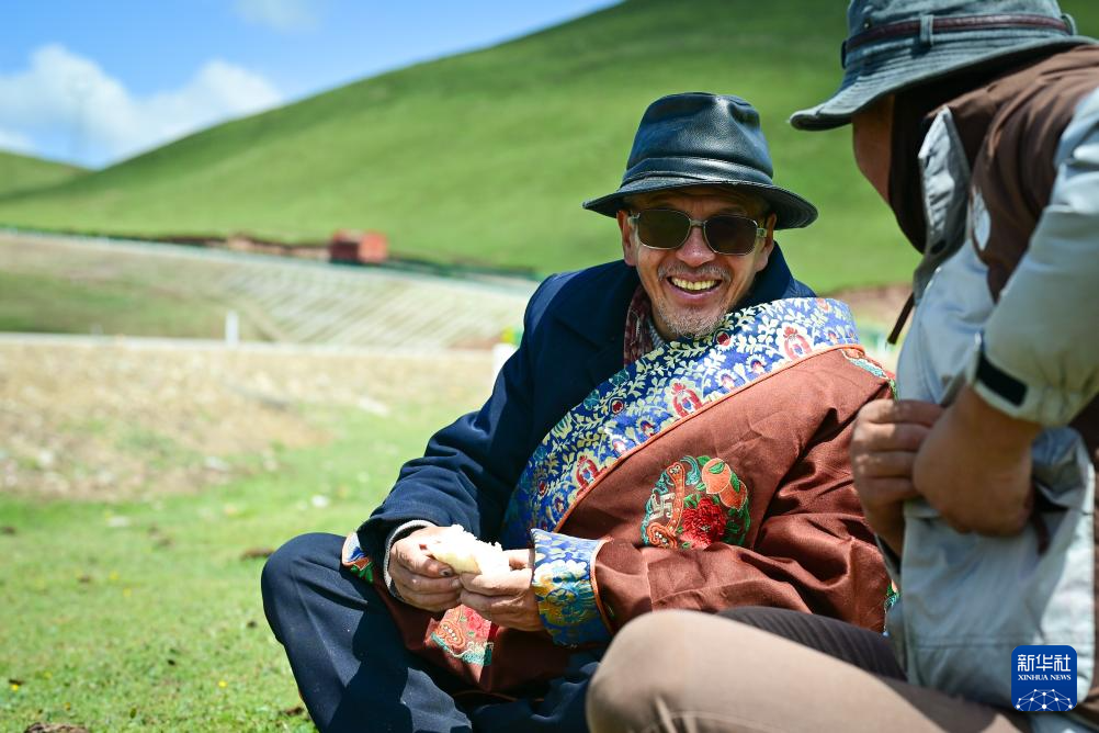 6月25日中午,万卓(左)与先巴尖措在转场途中休息吃饭。新华社记者 齐芷玥 摄