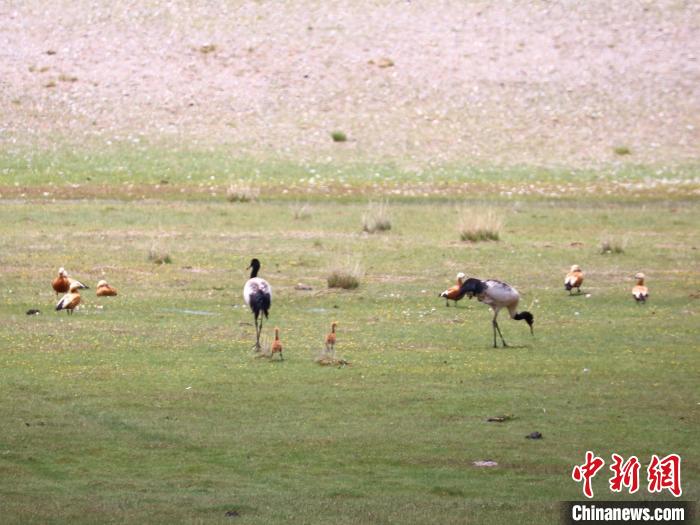 图为黑颈鹤与其他鸟类“同框”觅食。 吴永林 摄